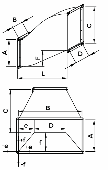 Оптимальная конструкция изделия позволяет эффективно адаптировать трассу вентиляции в условиях ограниченного пространства, сохраняя стабильный воздушный поток и минимальные потери давления. Переход изготовлен из оцинкованной стали, что обеспечивает надежность и длительный срок эксплуатации.